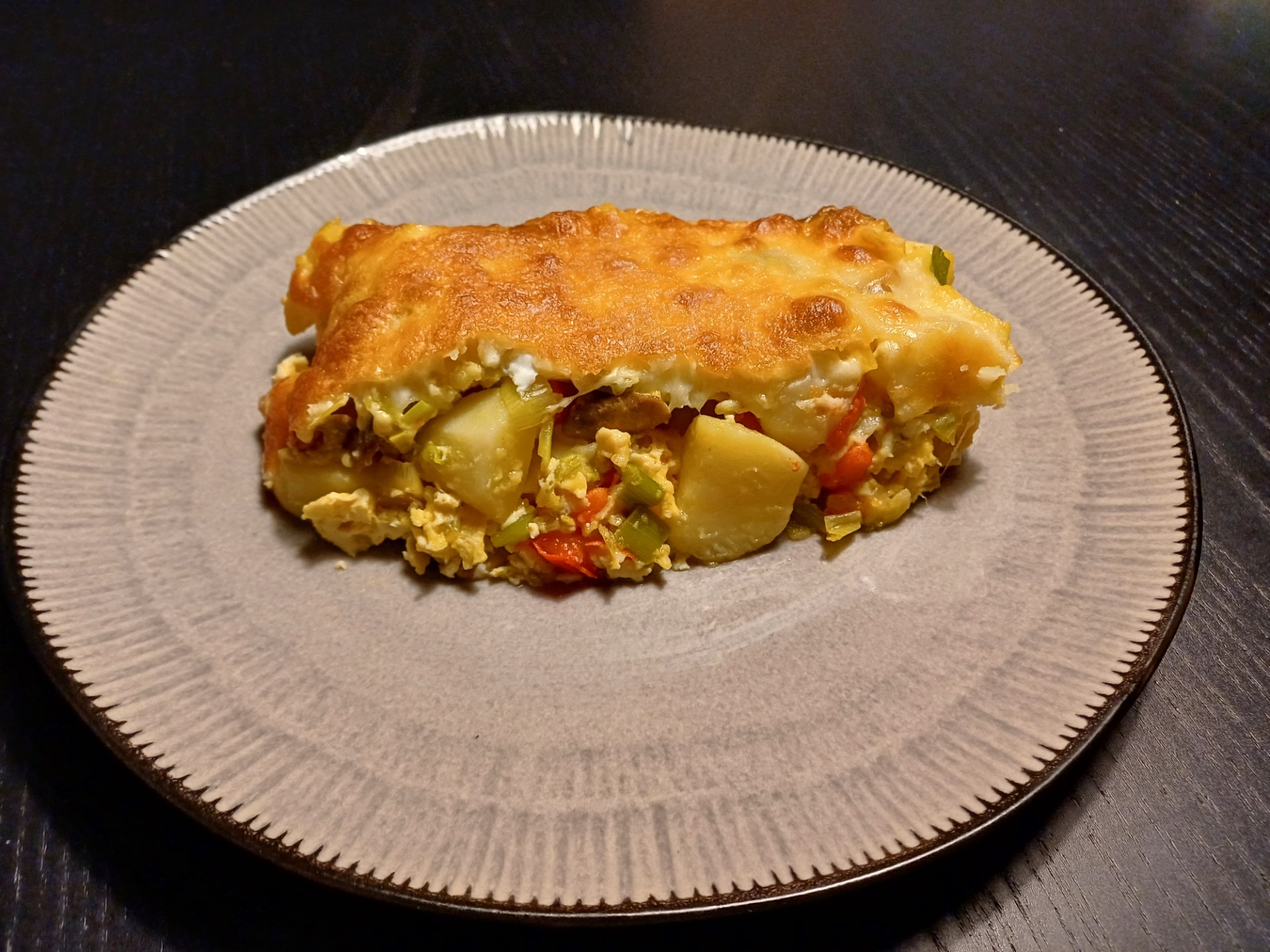 Klop in een kommetje de eieren los met de soyamelk en wat zout en peper. Verdeel dat mengsel over de groente en strooi daar tenslotte de geraspte kaas over.