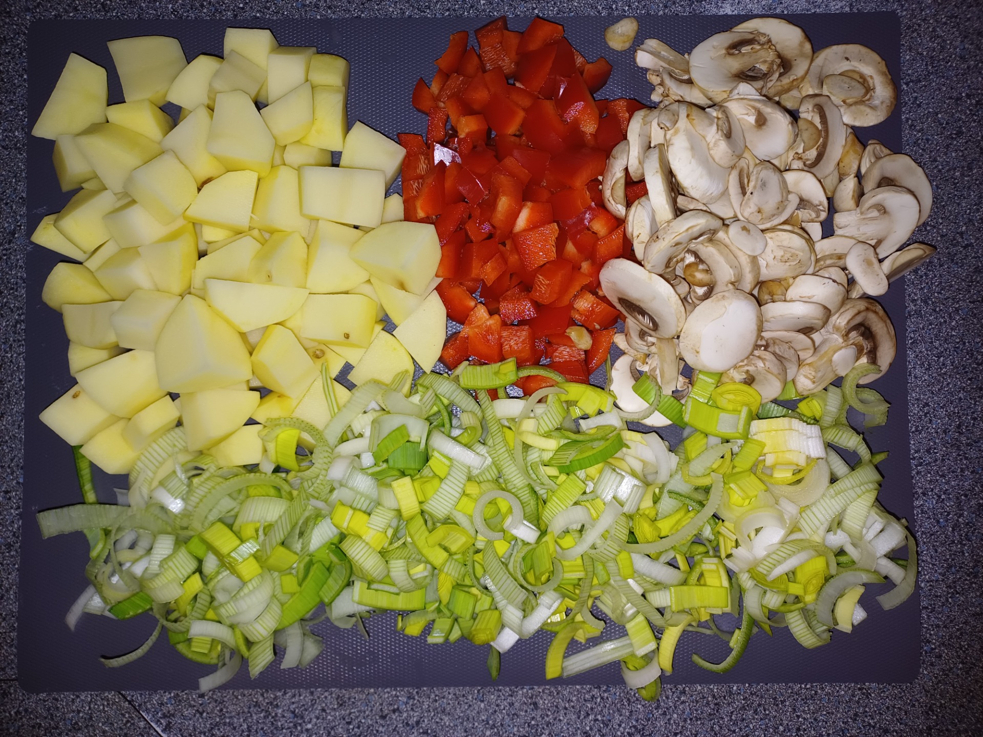 Snij de aardappelen en paprika in blokjes, prei in halve ringen en de champignons in schijfjes.