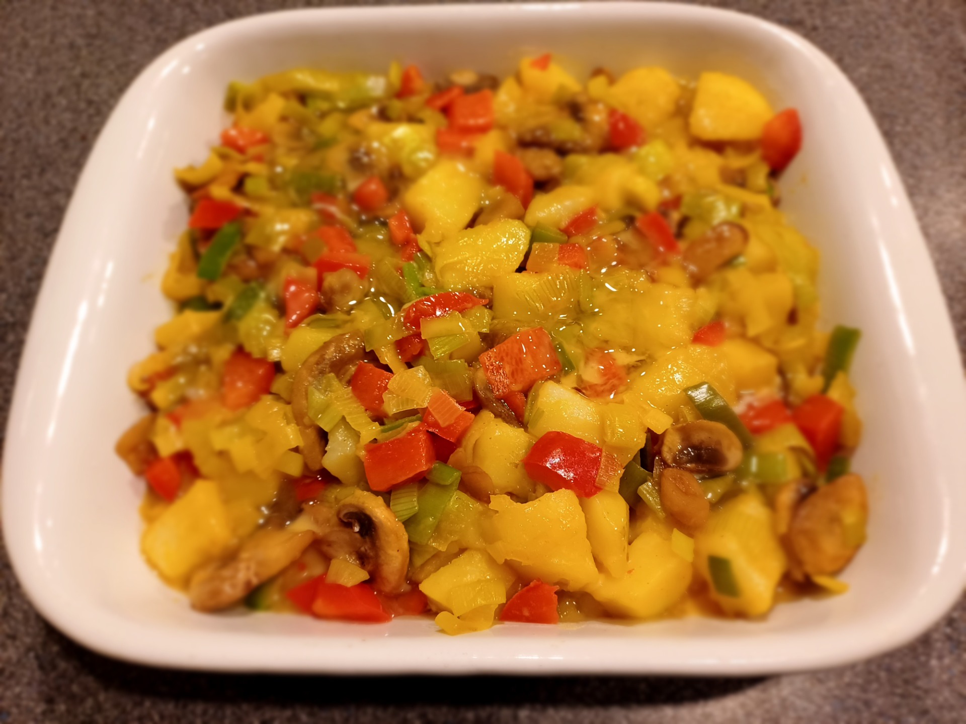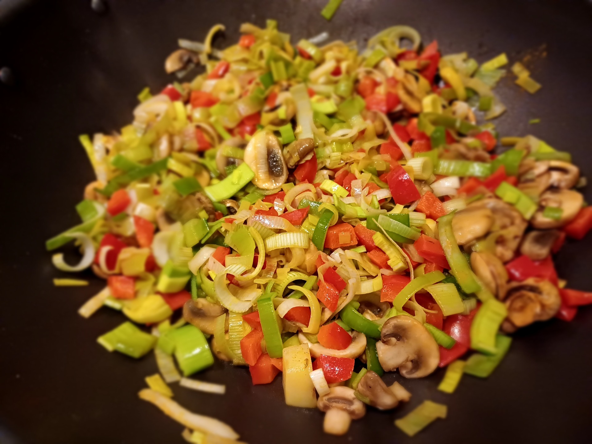 Zet de aardappelen op in een laagje water en kook ze gaar terwijl je de andere groente roerbakt in wat olie met de kruiden.