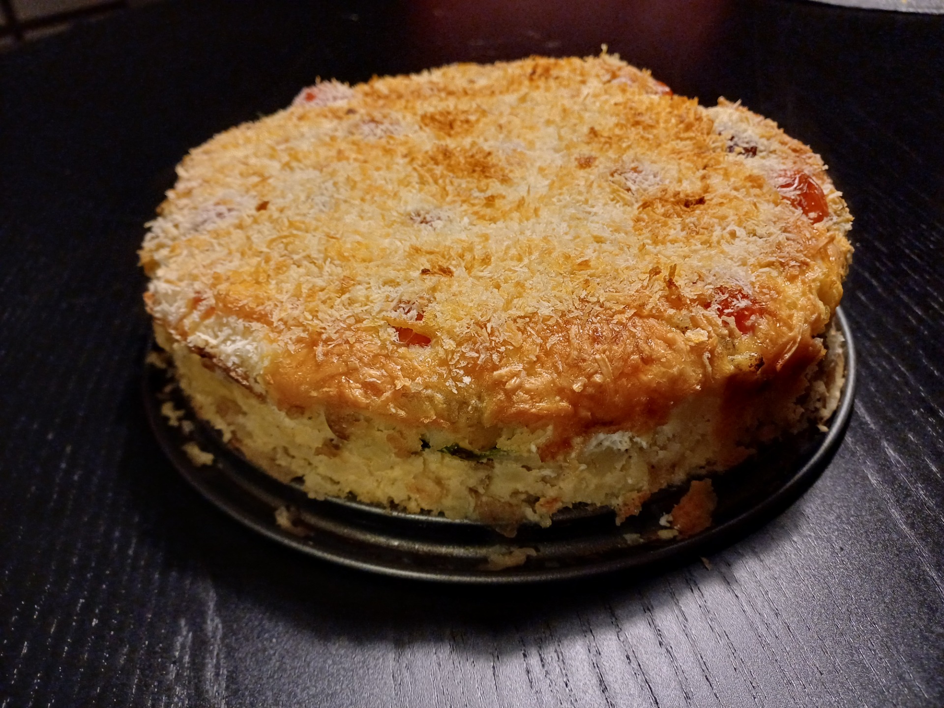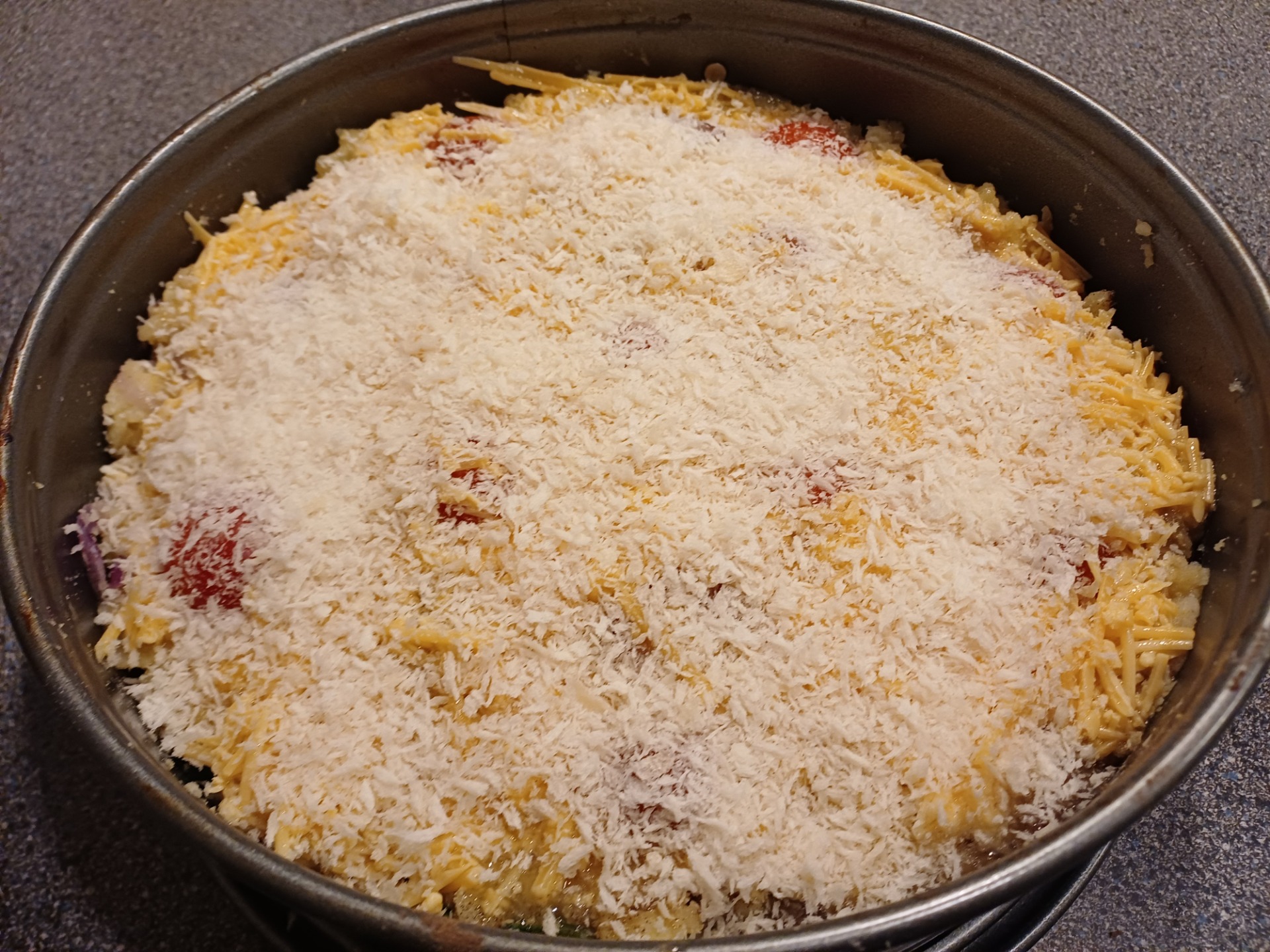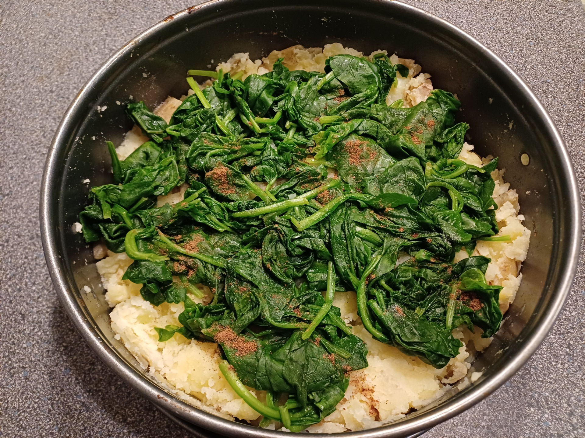 Ingrediënten: 750 gr kruimige aardappelen, 400 gr verse spinazie, 1 rode ui, een paar cherrytomaten, 4 eieren, geraspte kaas, grof paneermeel (Panko), olijfolie, zout, peper, nootmuskaat