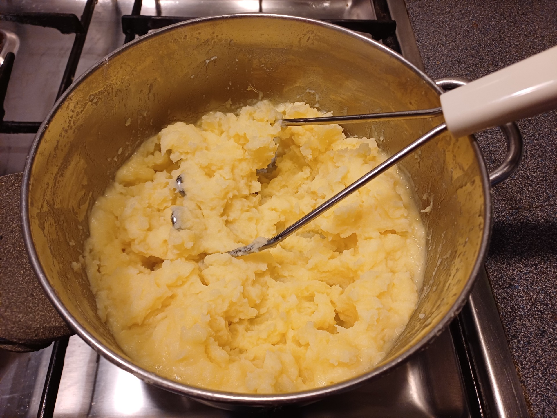 Wanneer de aardappelen gaar zijn, giet ze af en stamp ze klein met toevoeging van 50 gr boter, zout en 100 ml sojamelk.