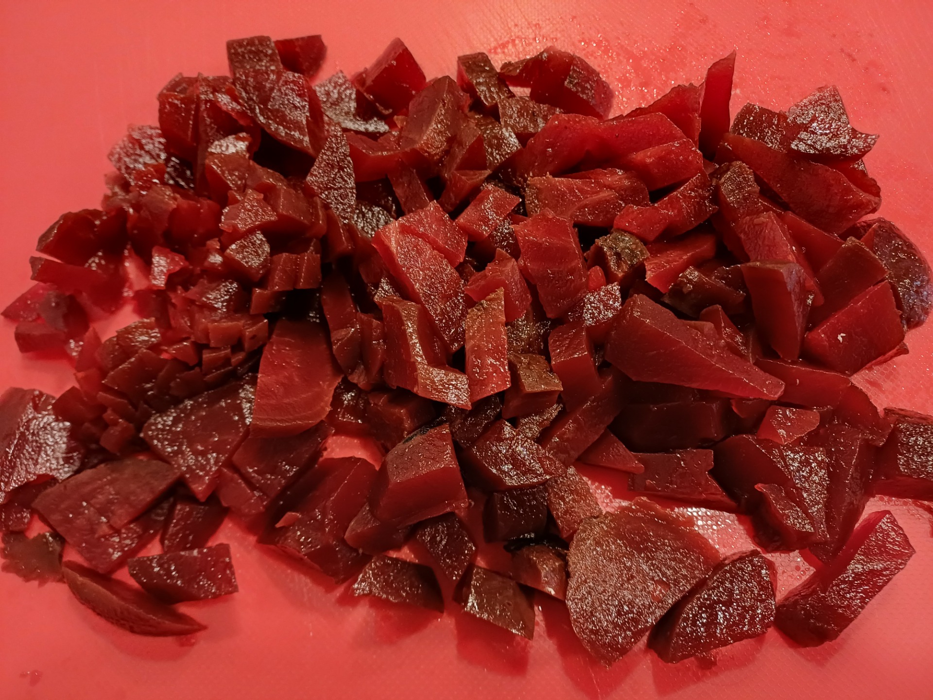 Snij de voorgekookte bieten en de appel in blokjes. Verwarm wat boter in een kleine koekenpan en bak daarin de appelblokjes.