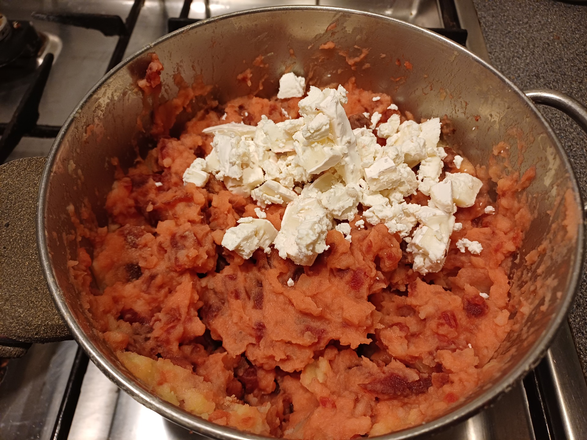 500 gr kruimige aardappelen, 1 zure appel, 500 gr voorgekookte bieten, 100 gr geitenkaas, zout, peper, 50 gr plantaardige boter, 100 ml sojamelk, zout.