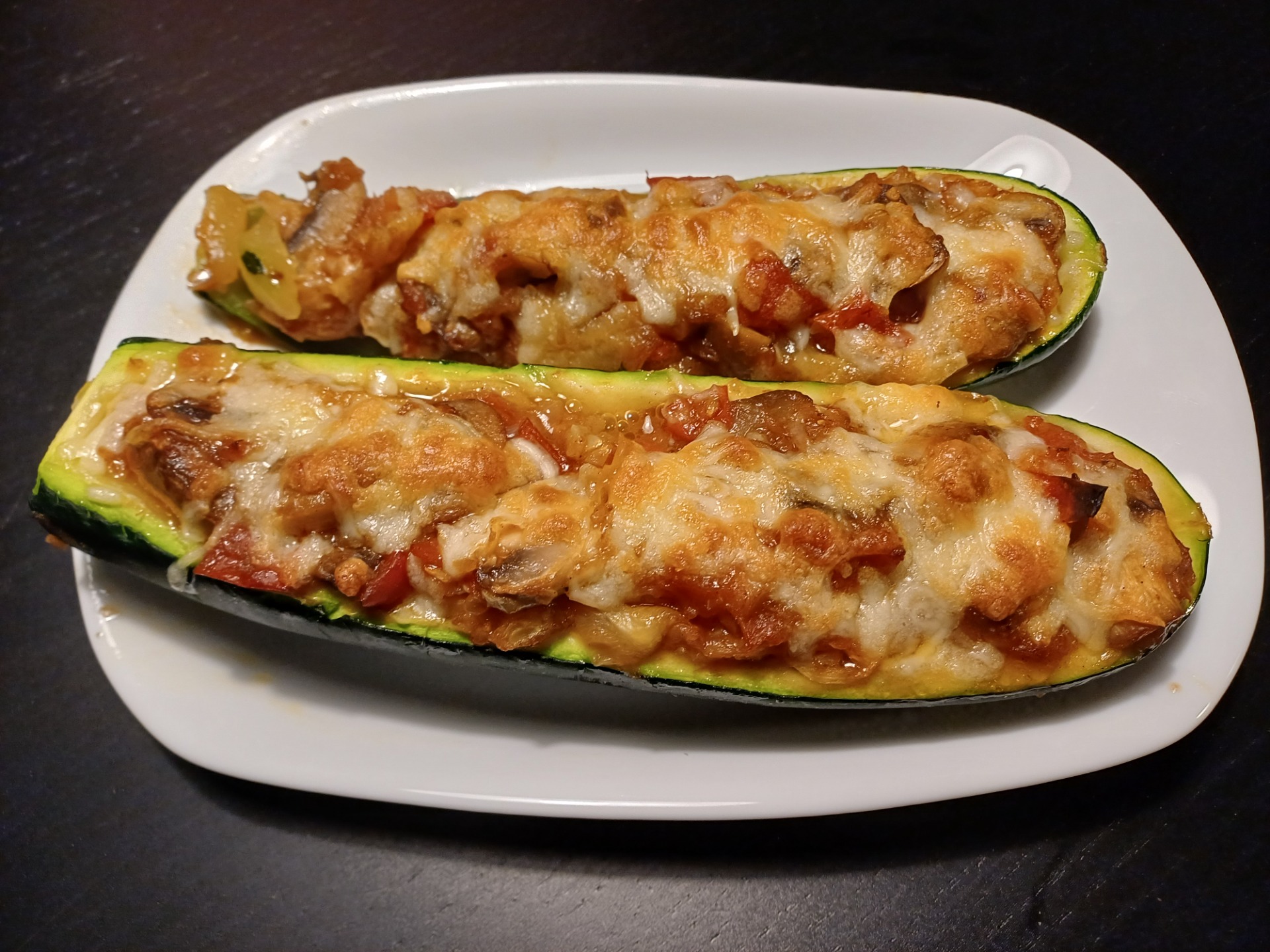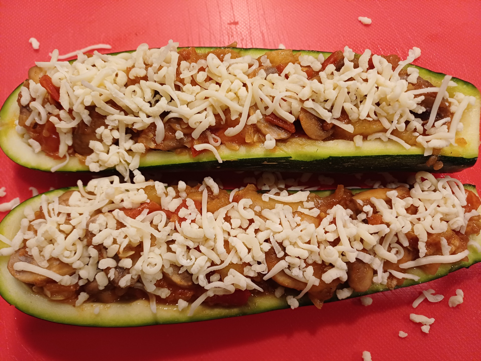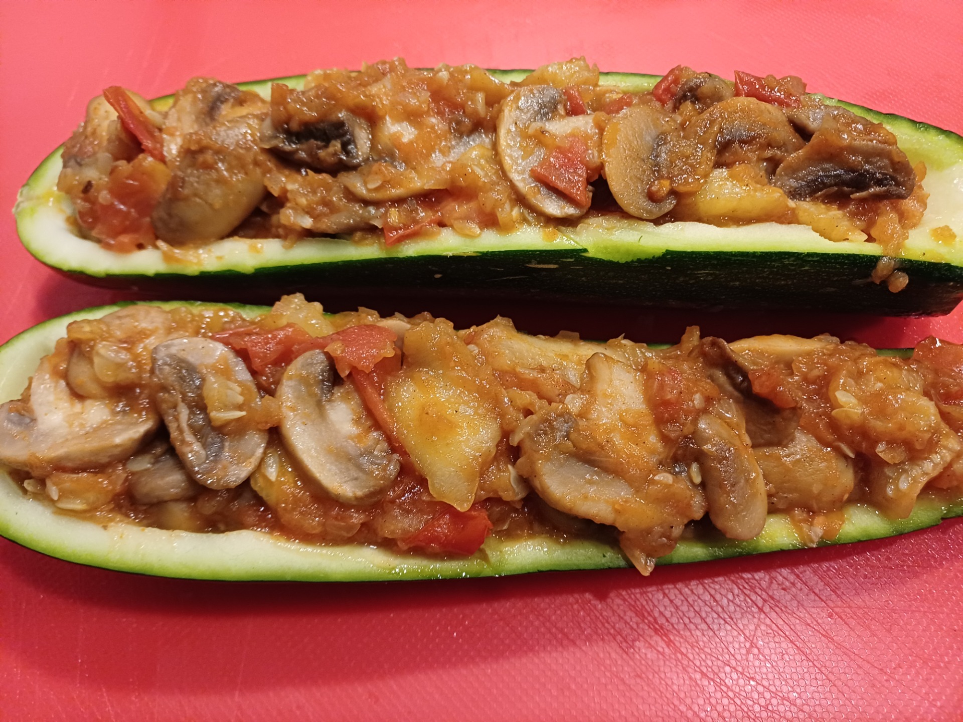 Gevulde courgette met champignons uit de oven. Een makkelijk snel te bereiden gerecht. Hiermee kun je alle kanten op en naar eigen smaak ingrediënten toevoegen.