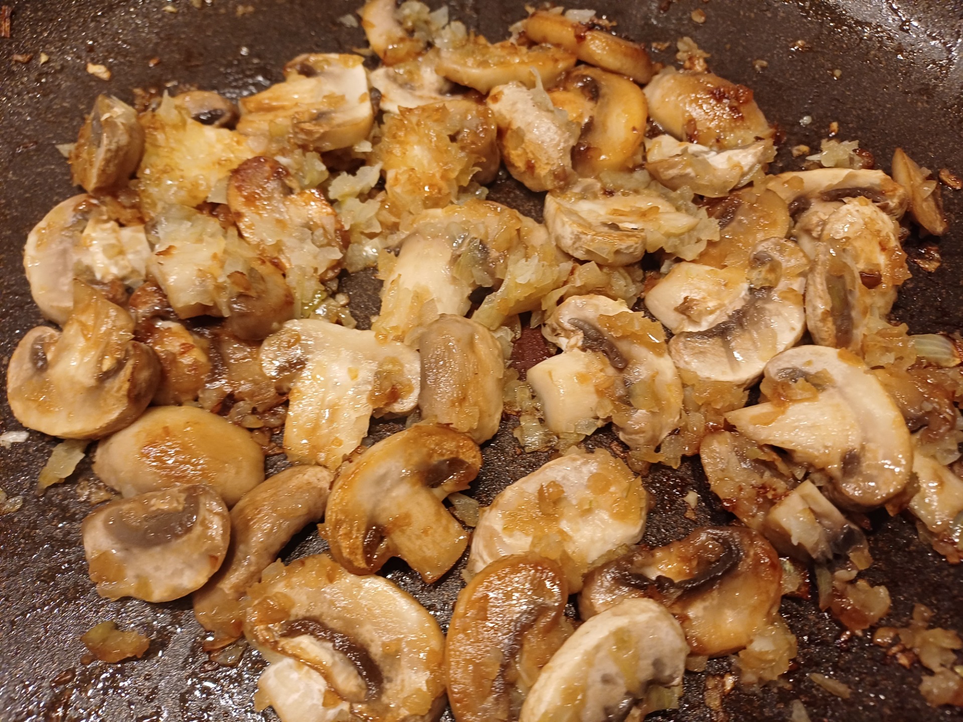 Verwarm wat boter in een koekenpan en bak daarin de ui en champignonschijfjes.