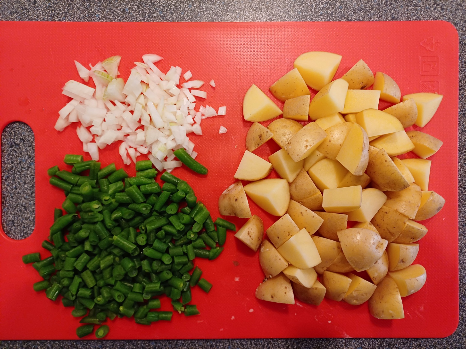 Snipper de ui en snij de aardappelen in kleine blokjes en de sperziebonen in kleine stukjes.