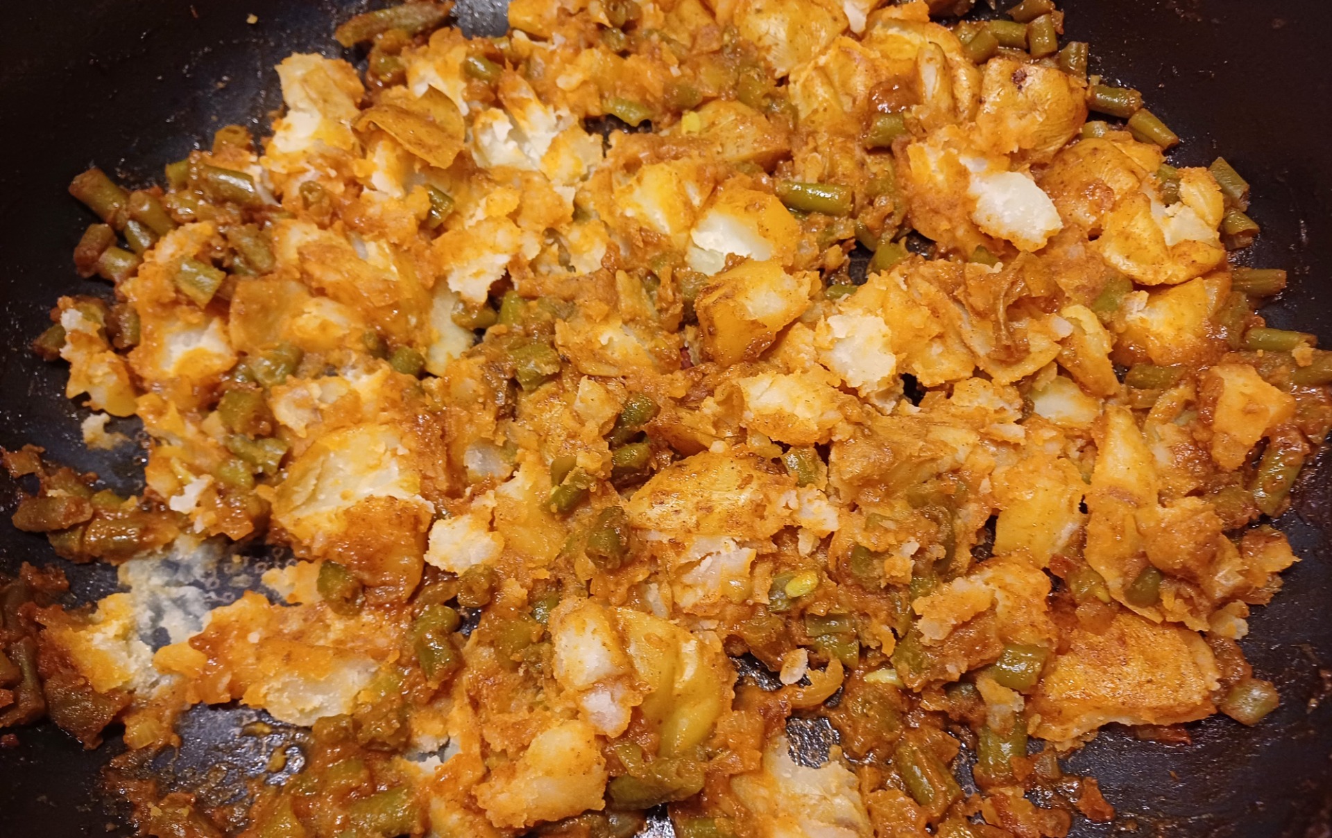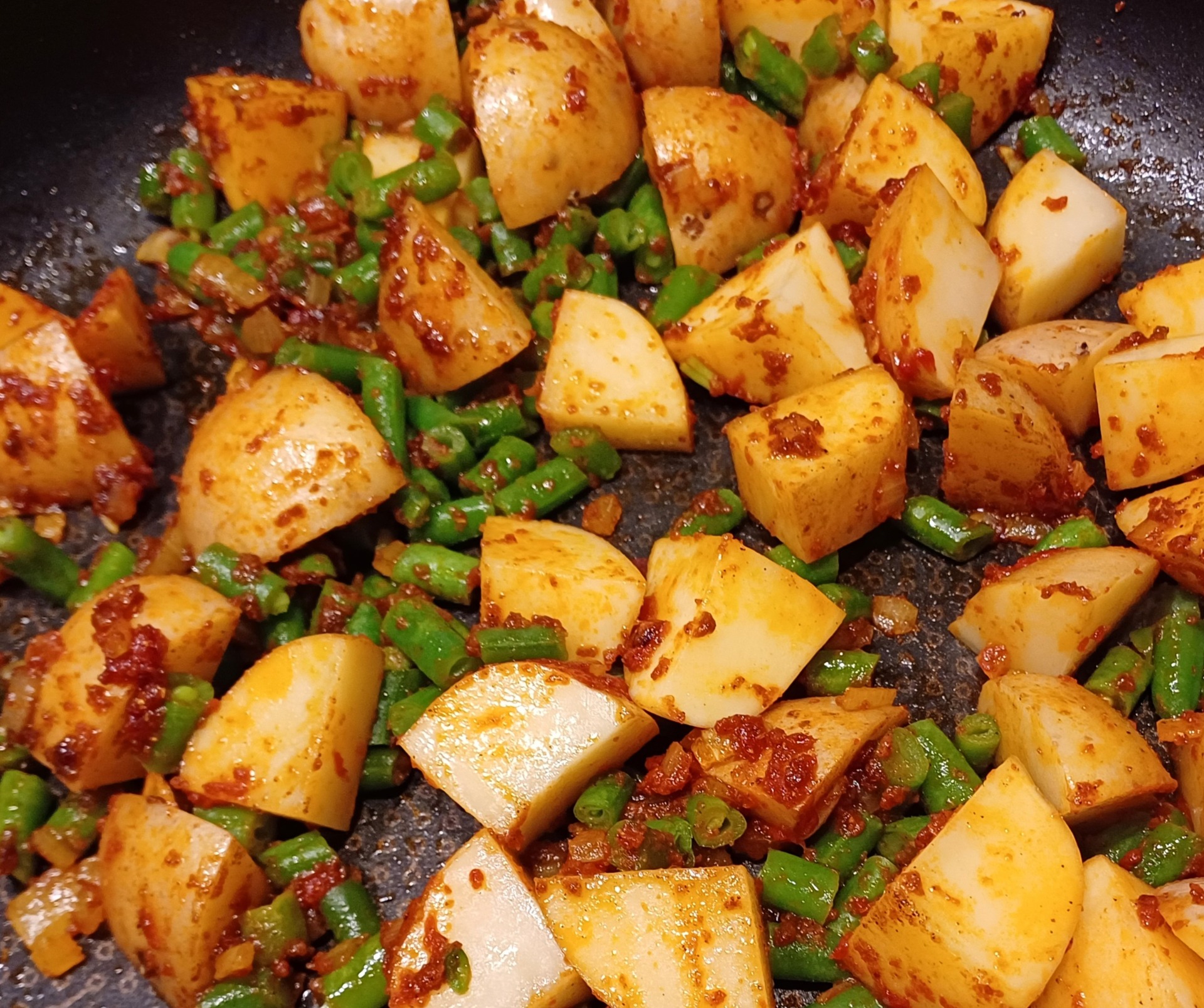 Voeg daarna de aardappelblokjes en de sperziebonen stukjes toe en meng het goed door elkaar.