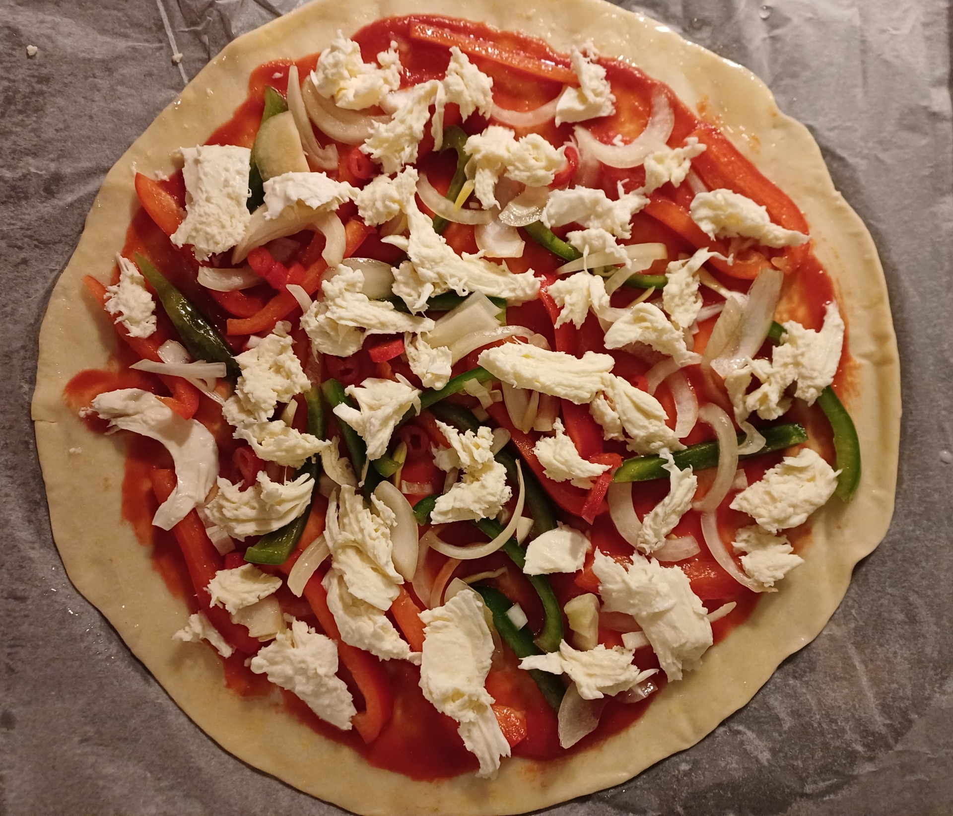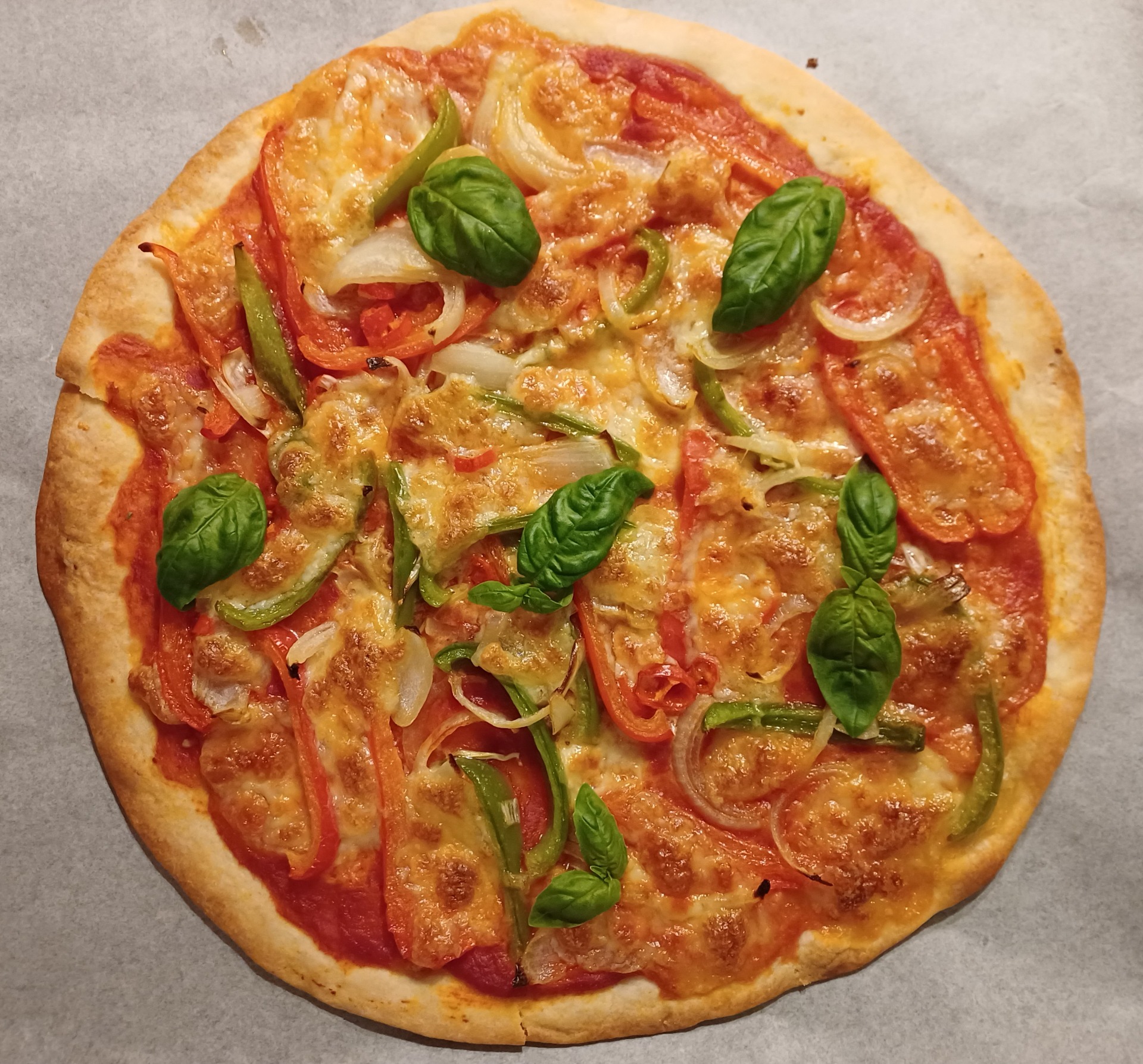 Ingrediënten: 1 pizzabodem, tomaten passata, 1/2 groene paprika, 1/2 rode paprika, 1 ui, 1/2 rode peper, mozzarella, verse basilicum, zout en peper, olijfolie
