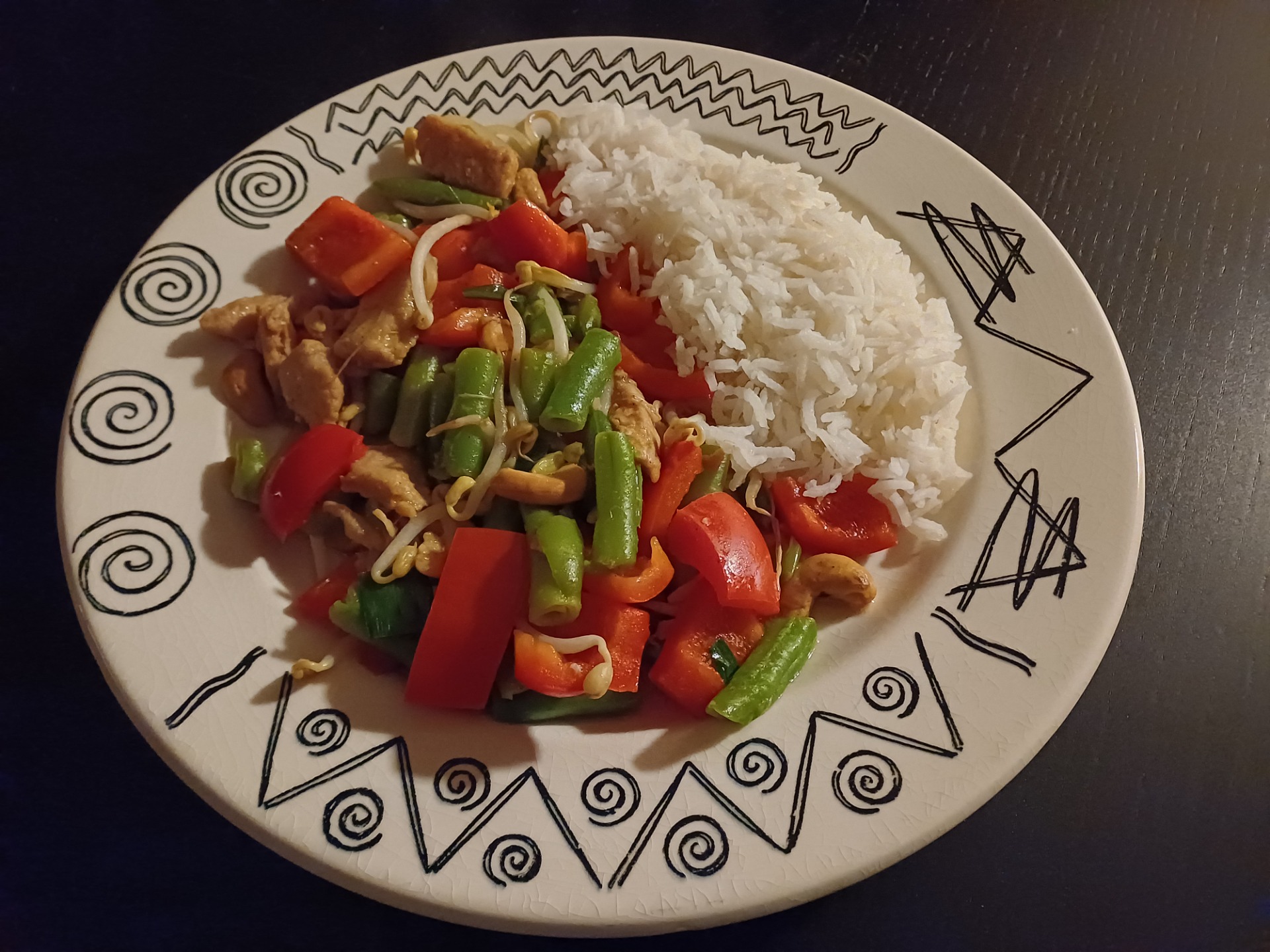 Verwarm wat plantaardige boter in een wok. Bak de vegetarische kipstukjes met de sojasaus, gemberpoeder, knoflookpoeder en wat zout en peper.