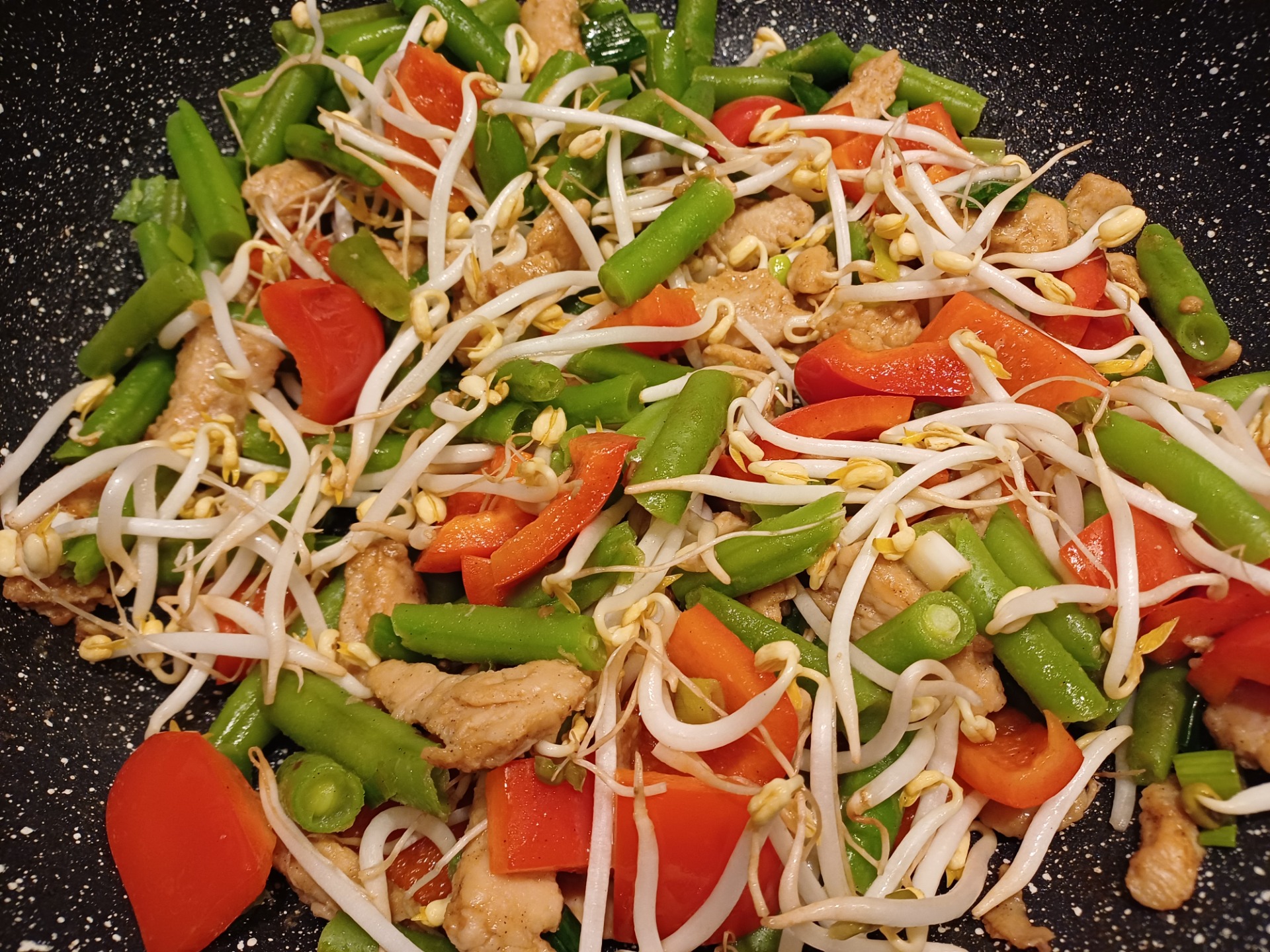Voeg na een paar minuten de paprikablokjes en bosuitjes toe. Roerbakken totdat de paprikablokjes iets zachter beginnen te worden. De sperziebonen en taugé toevoegen en roerbakken totdat de taugé iets zachter begint te worden.