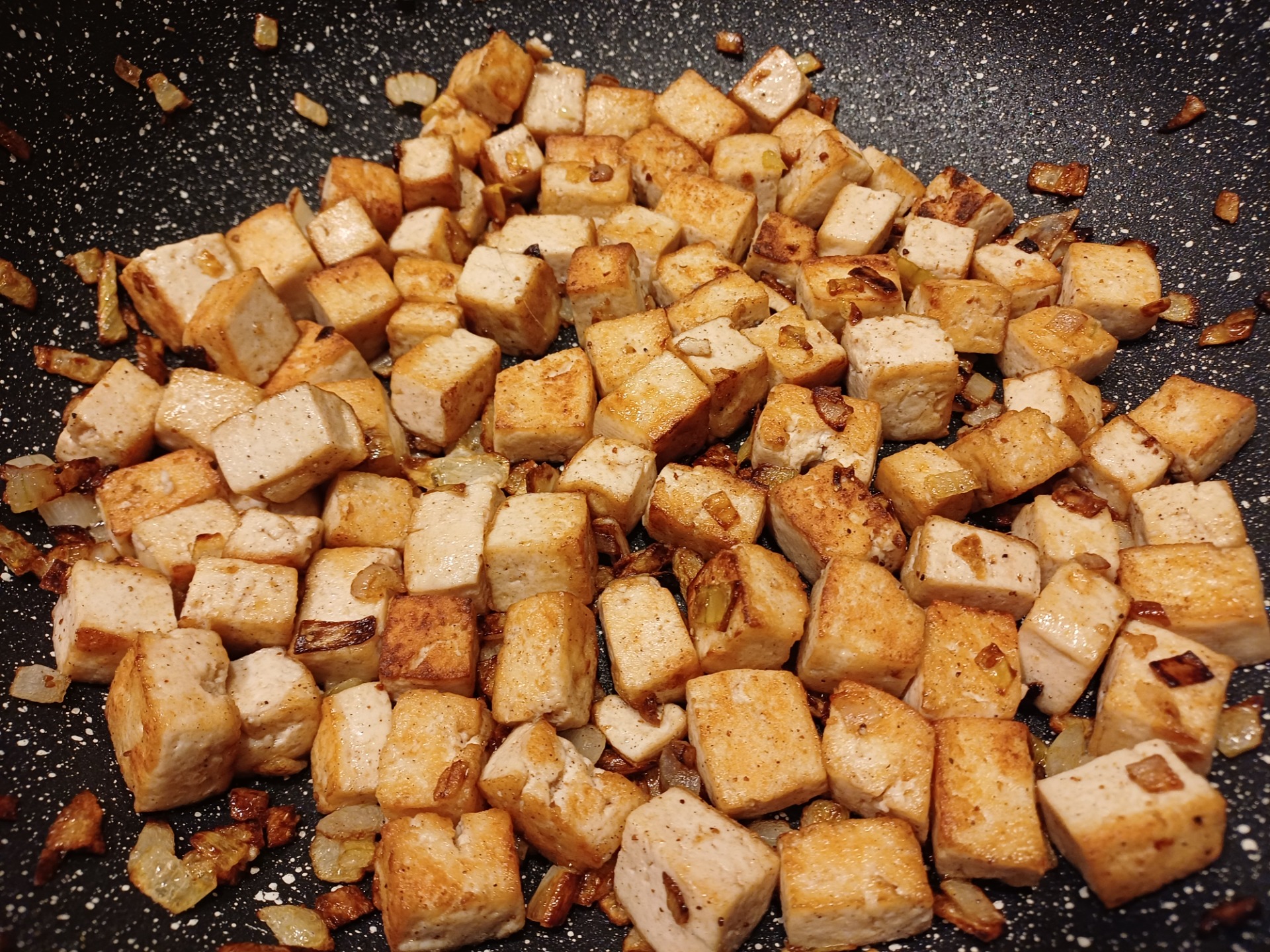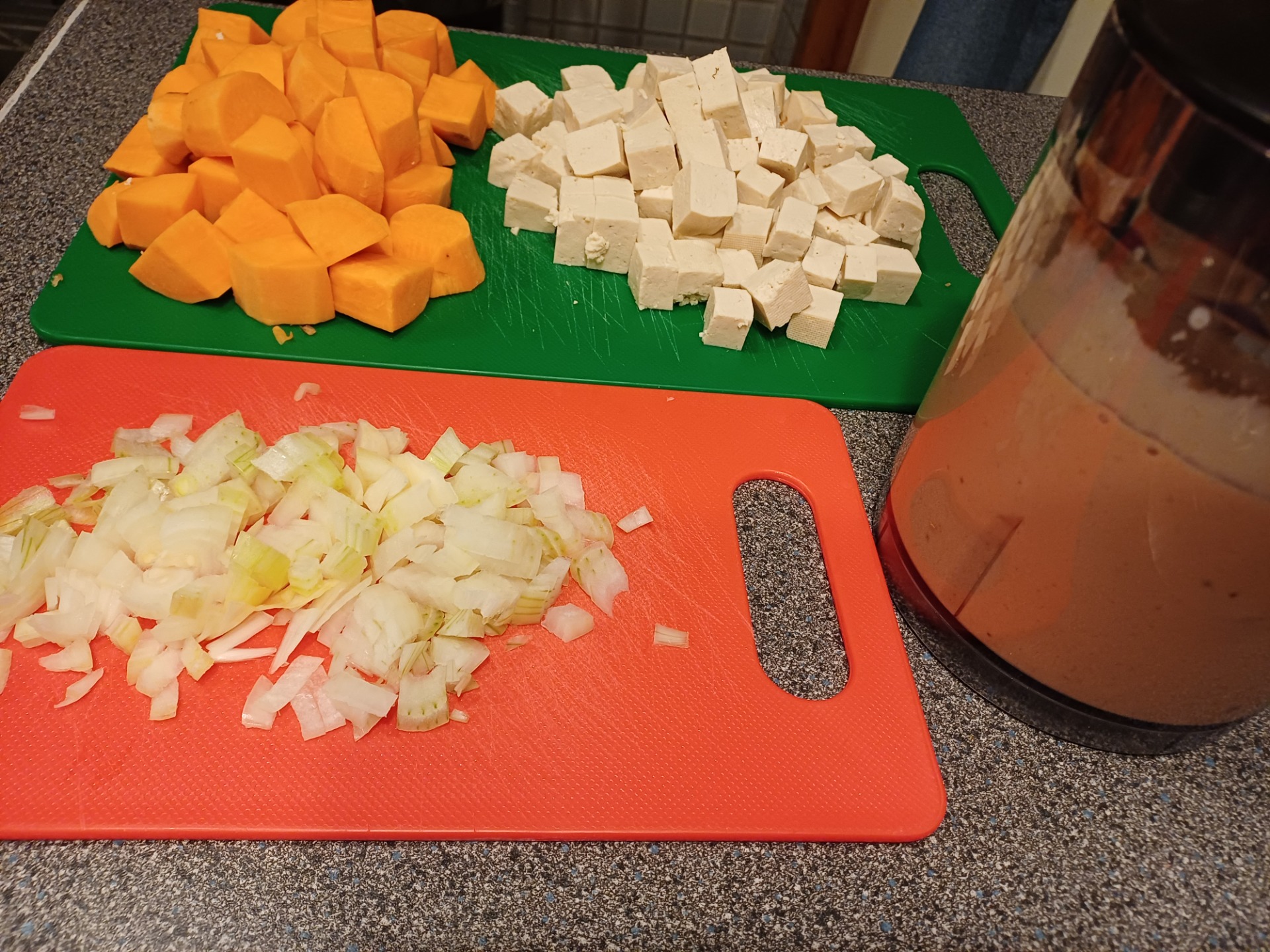 Snij de zoete aardappelen in blokjes en kook ze gaar, laat ze niet te gaar worden. Meestal is de kooktijd ongeveer 5 minuten. Druk het blok tofu tussen keukenpapier, totdat het meeste vocht eruit is. Snij dan de tofu in blokjes. Snipper de ui.
