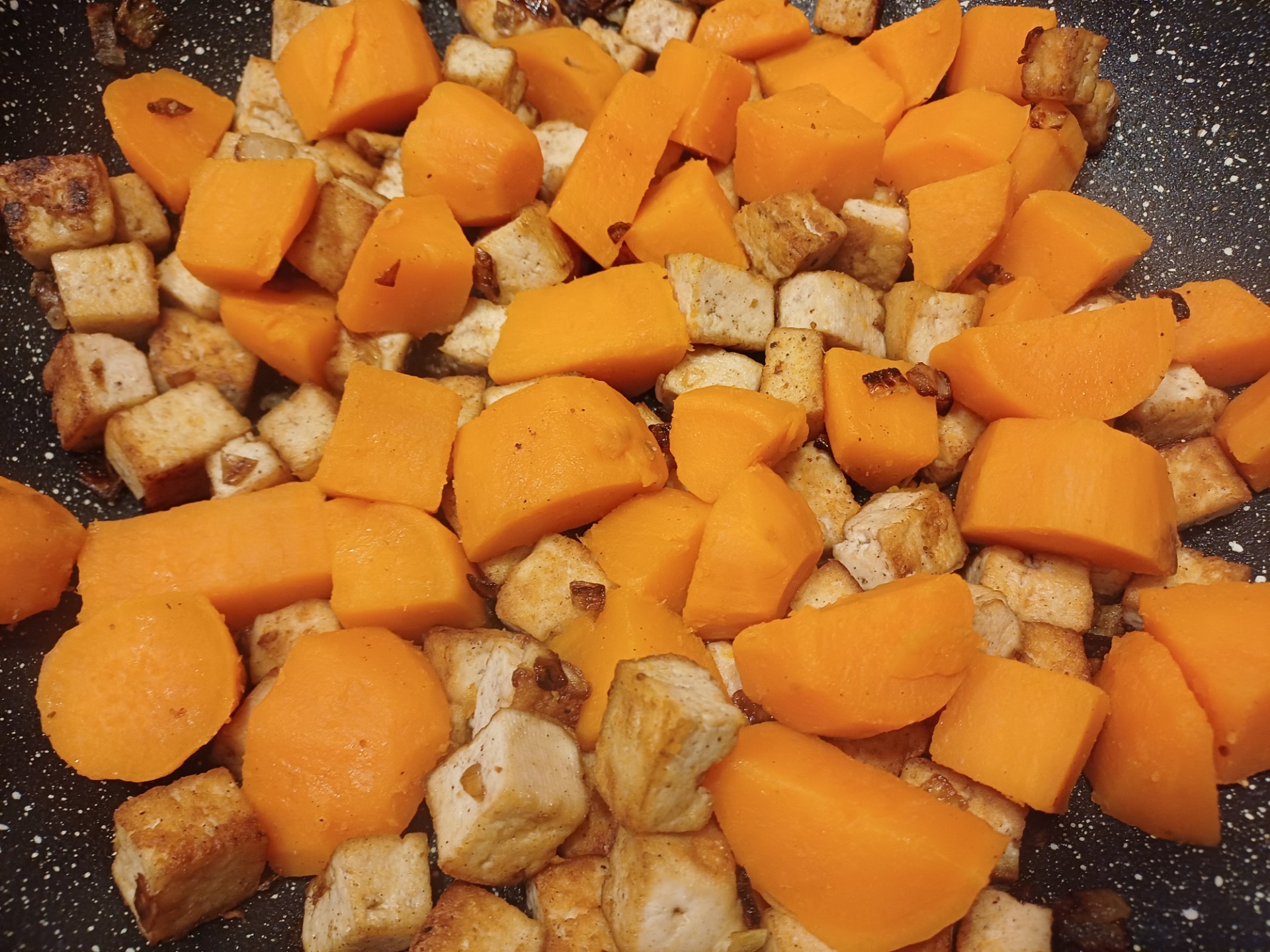 Verwarm wat plantaardige boter in een wok en bak de ui kort. Voeg de tofu en de kruiden toe en bak totdat de tofu een kleurtje heeft. Daarna de gare zoete aardappelblokjes erbij met de pasta.