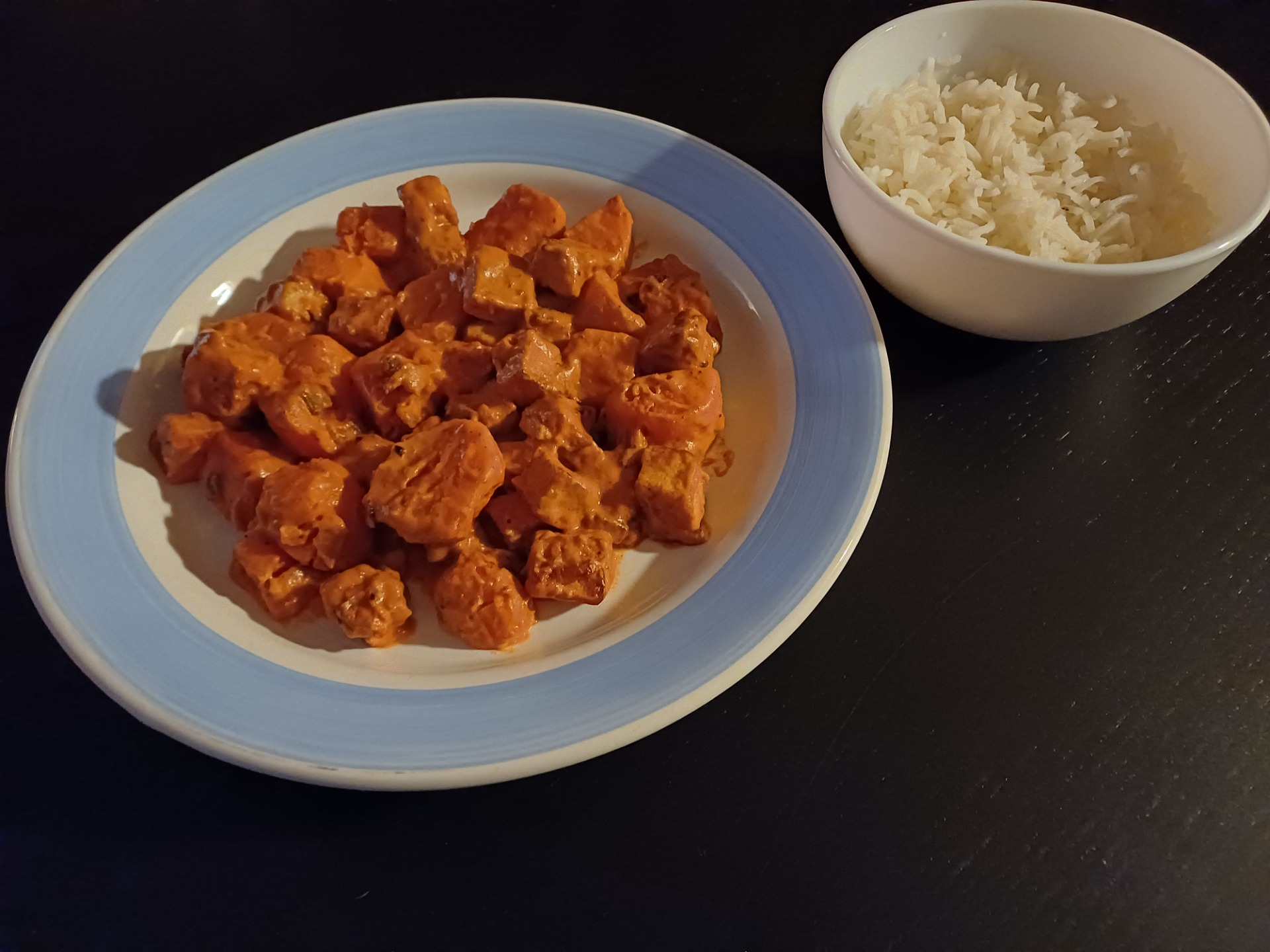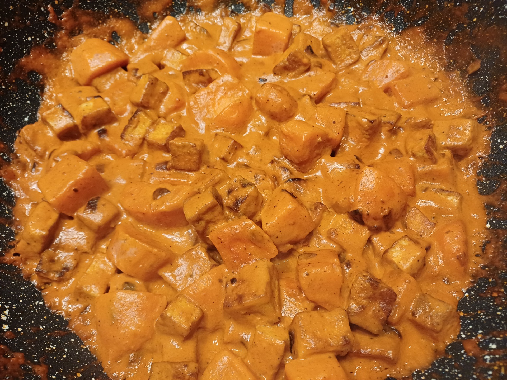 Een vegetarische variant op de bekende Indiase butter chicken, met tofu en zoete aardappel. Snel bereid en vol van smaak met een lekkere romige saus.