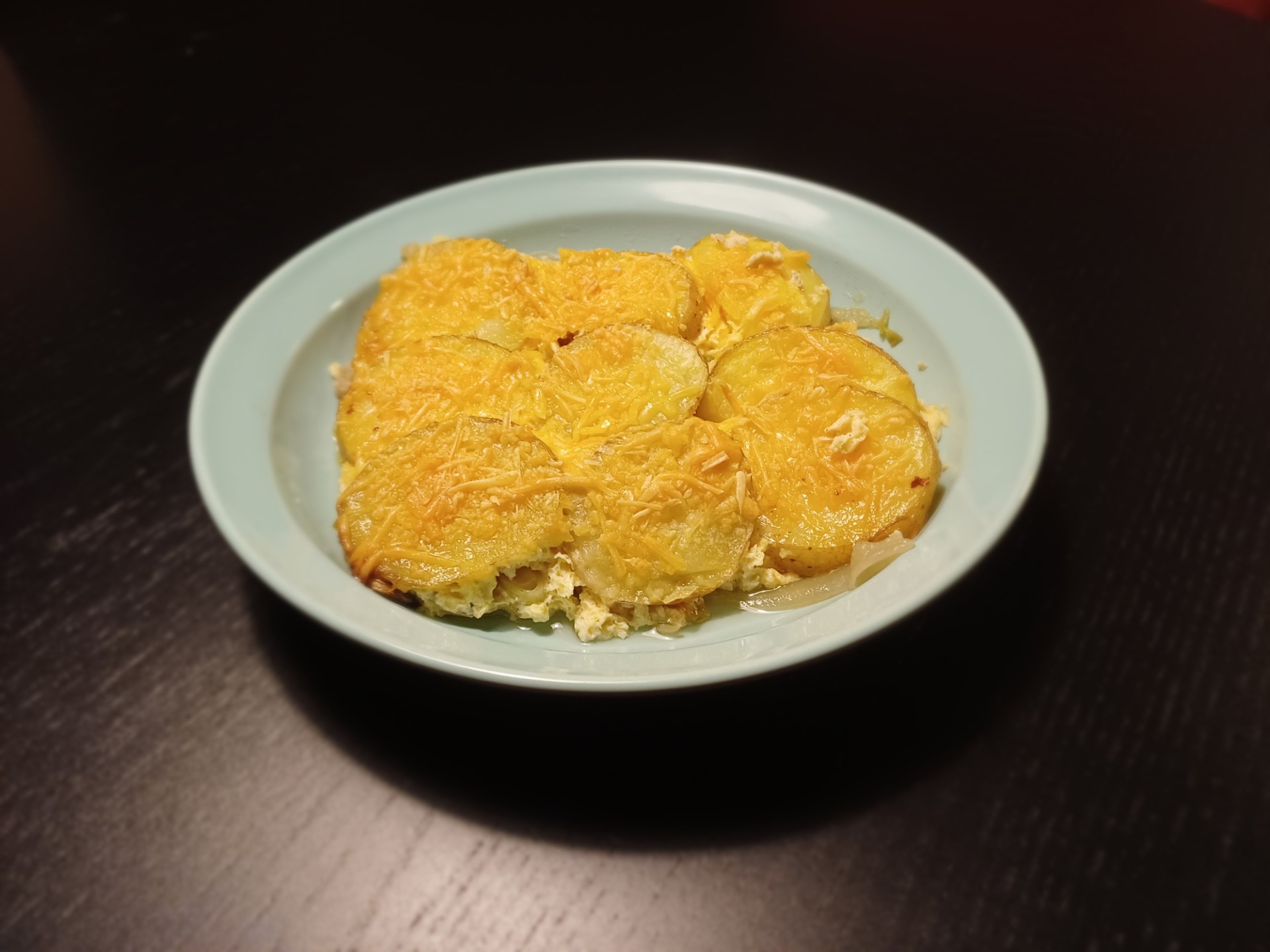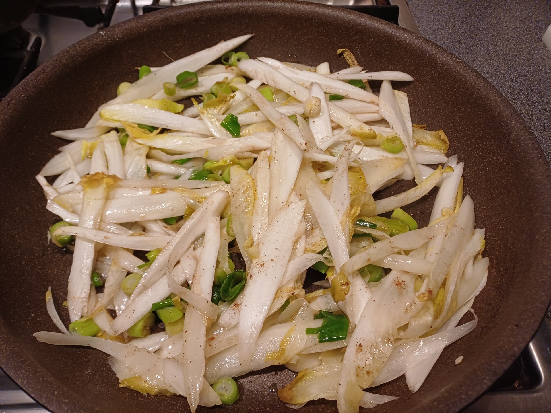 Ingrediënten voor 2 personen: 400 gr witlof, 400 gr kruimige aardappelen, 3 lente uitjes, 100 gr geraspte kaas, 2 eieren, 100 ml kookroom, nootmuskaat, zout, peper